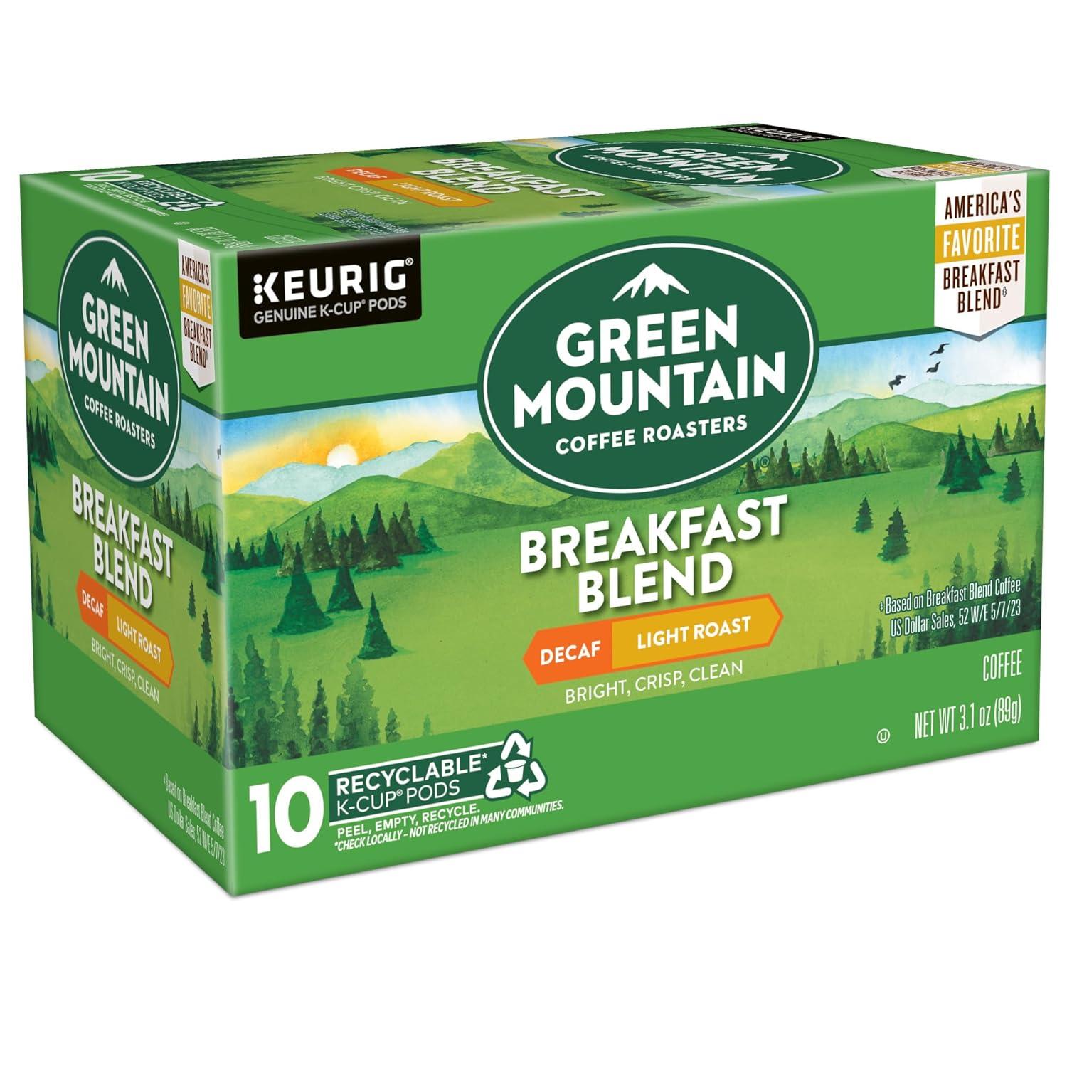 The mountains are a special place. It's where Green Mountain Coffee Roasters was born. It's where we developed our adventurous spirit and commitment to improving the lands through sustainably sourced coffee. We're driven to bring the world a richer, better cup of coffee. Be bold. Be alive. Grab a cup and get out there. The Green Mountain Coffee Roasters Breakfast Blend Decaf is an eye-opening decaf coffee as delightful as the dawn itself. Clean and bright, with balanced sweetness, nutty flavor, and a silky mouthfeel. Made with 100% Arabica coffee. These single-serve K-Cup pods are compatible with all Keurig K-Cup Pod Single-Serve Coffee Makers. Each K-Cup pod is filled with the freshest ground coffee and brews a perfect, great tasting cup of coffee, every time. Certified Orthodox Union Kosher. What does being 100% responsibly sourced coffee mean? Responsibly Sourced means the coffee we purchase is grown and sold in adherence to a credible sourcing program that aligns with our company Responsible Sourcing Guidelines. Our coffee is 100% responsibly sourced.