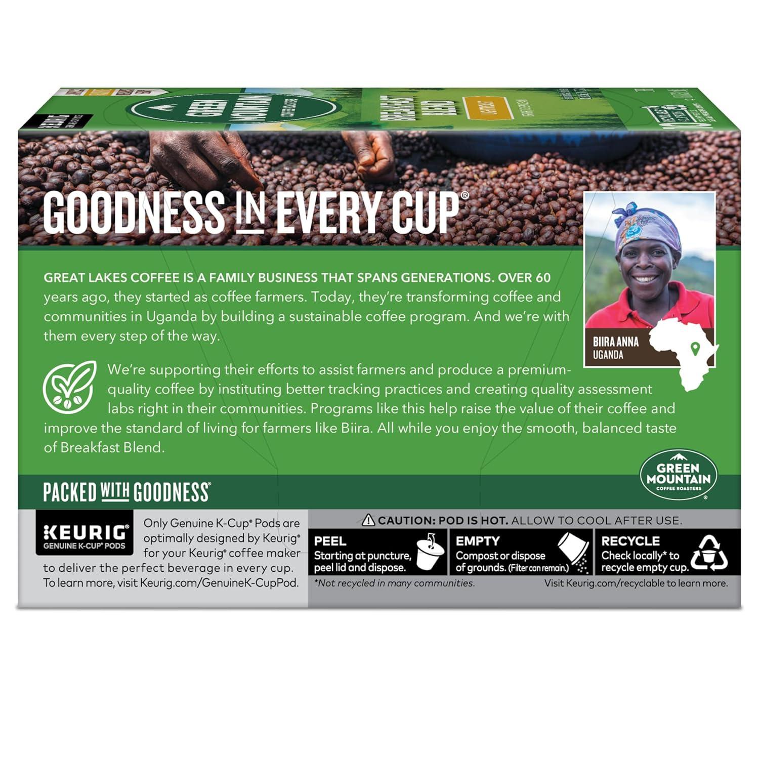 The mountains are a special place. It's where Green Mountain Coffee Roasters was born. It's where we developed our adventurous spirit and commitment to improving the lands through sustainably sourced coffee. We're driven to bring the world a richer, better cup of coffee. Be bold. Be alive. Grab a cup and get out there. The Green Mountain Coffee Roasters Breakfast Blend is as eye-opening and delightful as the dawn itself. Clean and bright, with balanced sweetness, nutty flavor, and a silky mouthfeel. Made with 100% Arabica coffee. These single-serve K-Cup pods are compatible with all Keurig K-Cup Pod Single-Serve Coffee Makers. Each K-Cup pod is filled with the freshest ground coffee and brews a perfect, great tasting cup of coffee, every time. Certified Orthodox Union Kosher. What does being 100% responsibly sourced coffee mean? Responsibly Sourced means the coffee we purchase is grown and sold in adherence to a credible sourcing program that aligns with our company Responsible Sourcing Guidelines. Our coffee is 100% responsibly sourced. Introducing Recyclable* K-Cup Pods: Simple. Delicious. And now Recyclable. Enjoy the same great-tasting coffee you know and love, and when you’re done just peel, empty and recycle. *Check locally, not recycled in all communities. Packaging may vary. Great Lakes Coffee is a family business that spans generations. Over 60 years ago, they started as coffee farmers. Today, they’re transforming coffee and communities in Uganda by building a sustainable coffee program. And we’re with them every step of the way. We’re supporting their efforts to assist farmers and produce a premium-quality coffee by instituting better tracking practices and creating quality assessment labs right in their communities. Programs like this help raise the value of their coffee and improve the standard of living for farmers like Biira. All while you enjoy the smooth, balanced taste of Breakfast Blend.