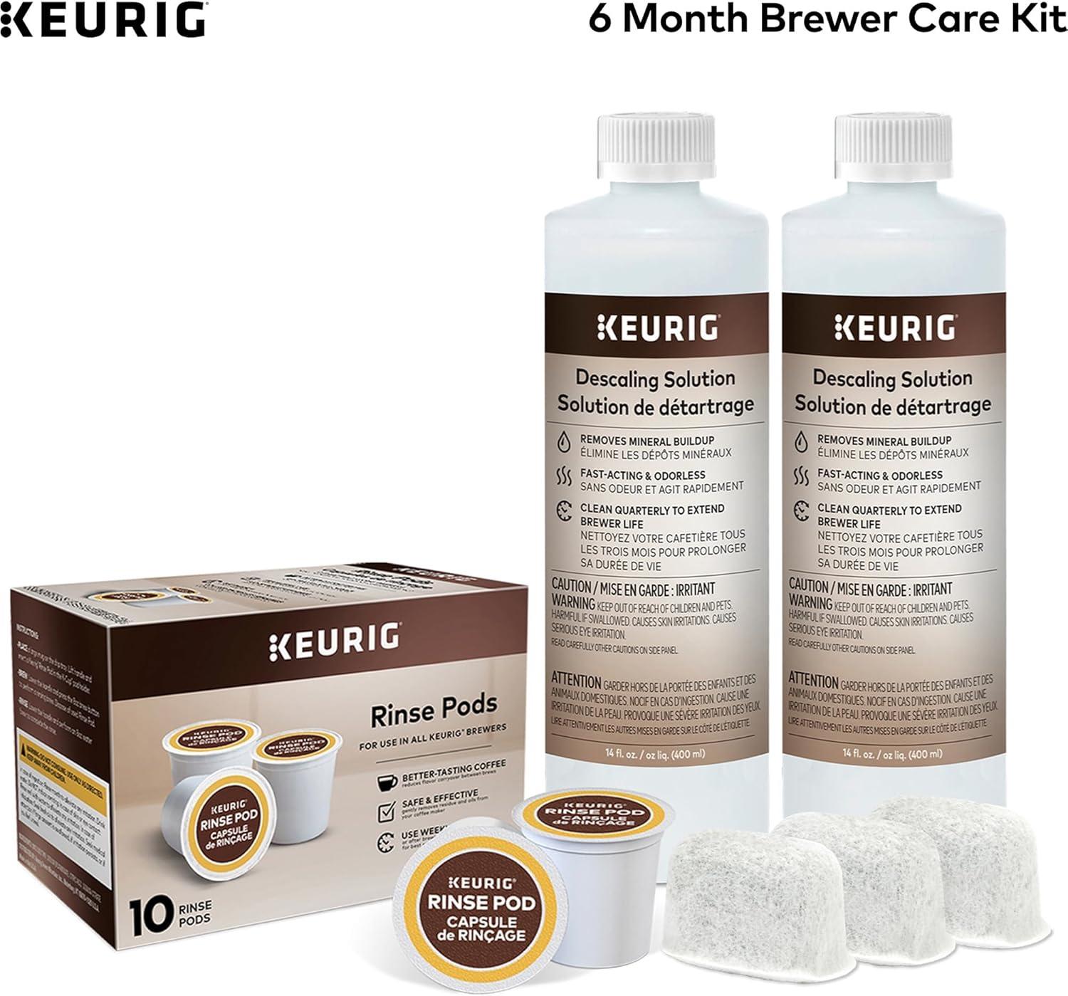 Cleaning your coffee maker regularly is an important step to keep it working at peak performance and keep your beverages tasting their best. The 6 Month Brewer Care Bundle has everything you need to regularly clean and maintain your brewer for 6 months. The Keurig 6 Month Brewer Care Bundle includes 2 bottles of Keurig Descaling Solution, 3 Water Filter Cartridges, and 10 Keurig Rinse Pods. The 6 Month Brewer Care Bundle is compatible with all Keurig coffee makers*. *If you have a Keurig K-Mini or K-Mini Plus brewer, we recommend that you consider our Keurig Cleanse Kit which only includes Keurig Descaling Solution and Keurig Rinse Pods as the K-Mini brewers do not use Water Filter Handles.