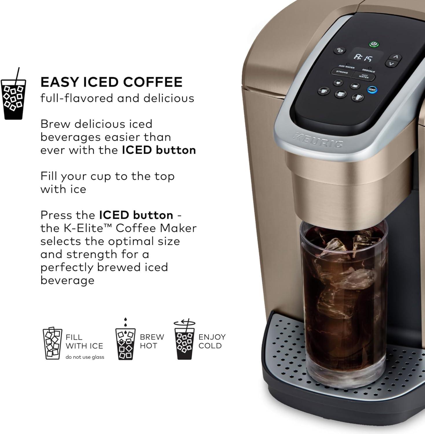 The Keurig K-Elite brewer blends a premium Brushed Silver finish and programmable features to deliver both modern design and the ultimate in beverage customization. With a striking brushed finish and metal details, it’s a stylish addition to any kitchen. The Keurig K-Elite single serve coffee maker features Strong Brew for when you want to brew a bolder cup of coffee, and an Iced button to brew hot over ice for a refreshing, full-flavored iced coffee. It features five brew sizes, so you can brew your favorite coffee, tea, hot cocoa, or iced beverage at the touch of a button. Choose from hundreds of delicious varieties of K-Cup pods, or brew your own ground coffee using the Universal My K-Cup Reusable Coffee Filter (sold separately). The K-Elite brewer offers programmable features like auto on and temperature control, as well as providing hot water on demand for instant soups and oatmeal, and the large 75oz removable water reservoir lets you brew 8 cups between refills.
