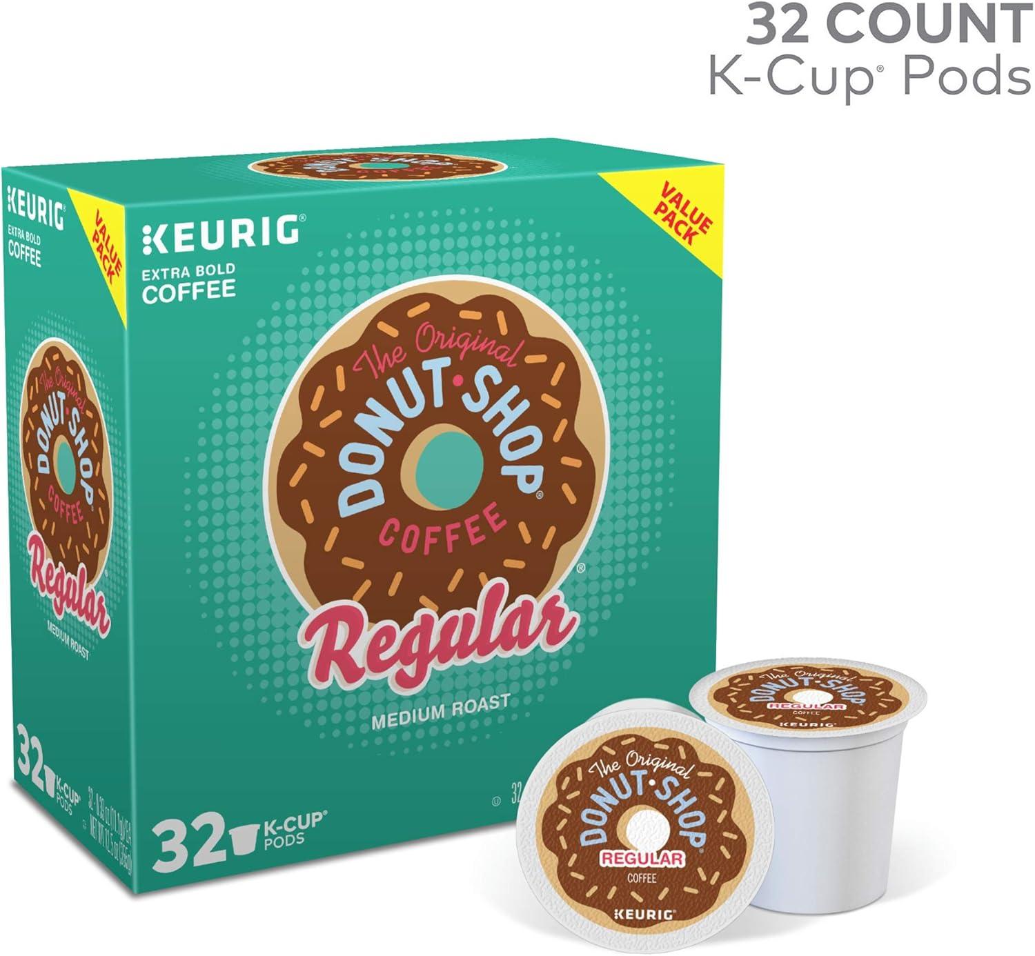 Keurig K-Mini Plus Single Serve Coffee Maker and The Original Donut Shop Regular K-Cup Pods, 32ct. Make anywhere perfect for great coffee with the slim and stylish Keurig K-Mini Plus Coffee Maker and a 32-count box of bold and flavorful The Original Donut Shop Regular coffee K-Cup pods. Keurig K-Mini Plus Coffee Maker: Say hello to our slimmest brewer yet. At less than five inches wide, the incredibly slim and easy-to-use K-Mini Coffee Maker makes anywhere perfect for great coffee. Perfect for small spaces, the K-Mini Coffee Maker combines sleek, modern design with space-saving convenience in a portable, stylish package that brews any cup size between 6 and 12oz of your favorite coffee in minutes. Includes pod storage for up to 9 K-Cup pods and a cord storage compartment for easy transport and tidy countertops. The Original Donut Shop Coffee Regular: Full-bodied, bold, and flavorful, our Regular is – quite simply – a cup full of happiness. This is an extra bold medium roast variety, so each pod contains more delicious coffee than average K-Cup pods.