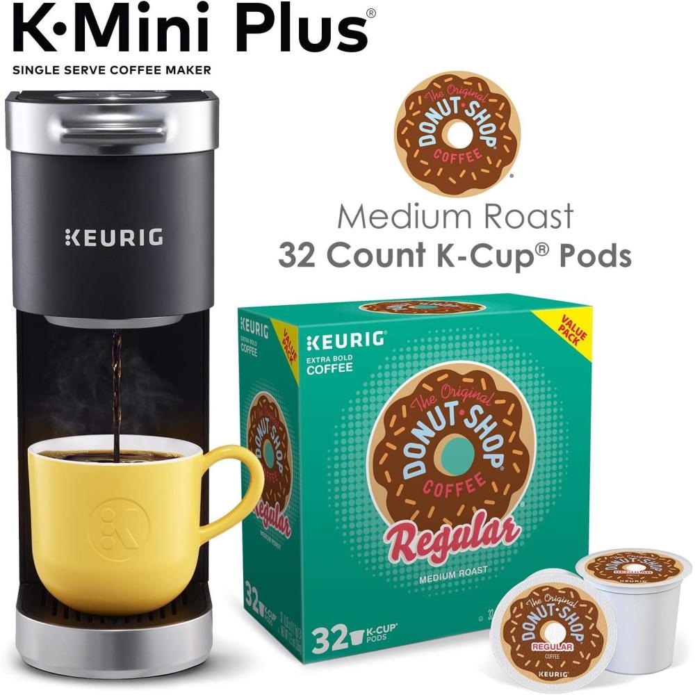 BUNDLE INCLUDES: Keurig K-Mini Plus Single Serve Coffee Maker in Matte Black and one 32-count box of The Original Donut Shop Regular coffee K-Cup pods.
