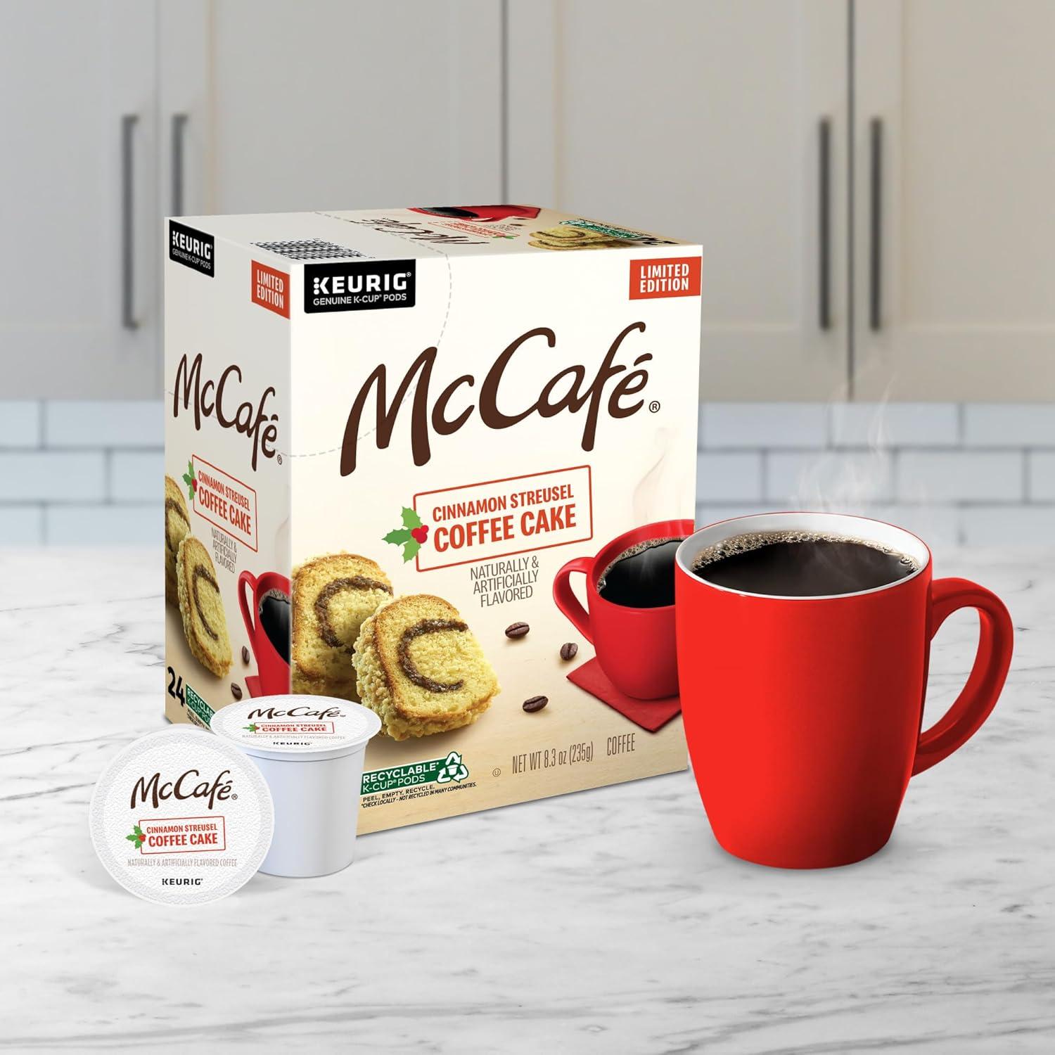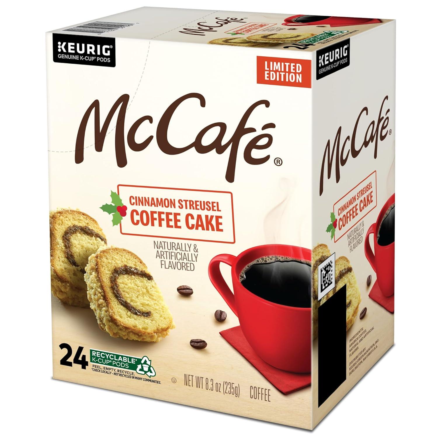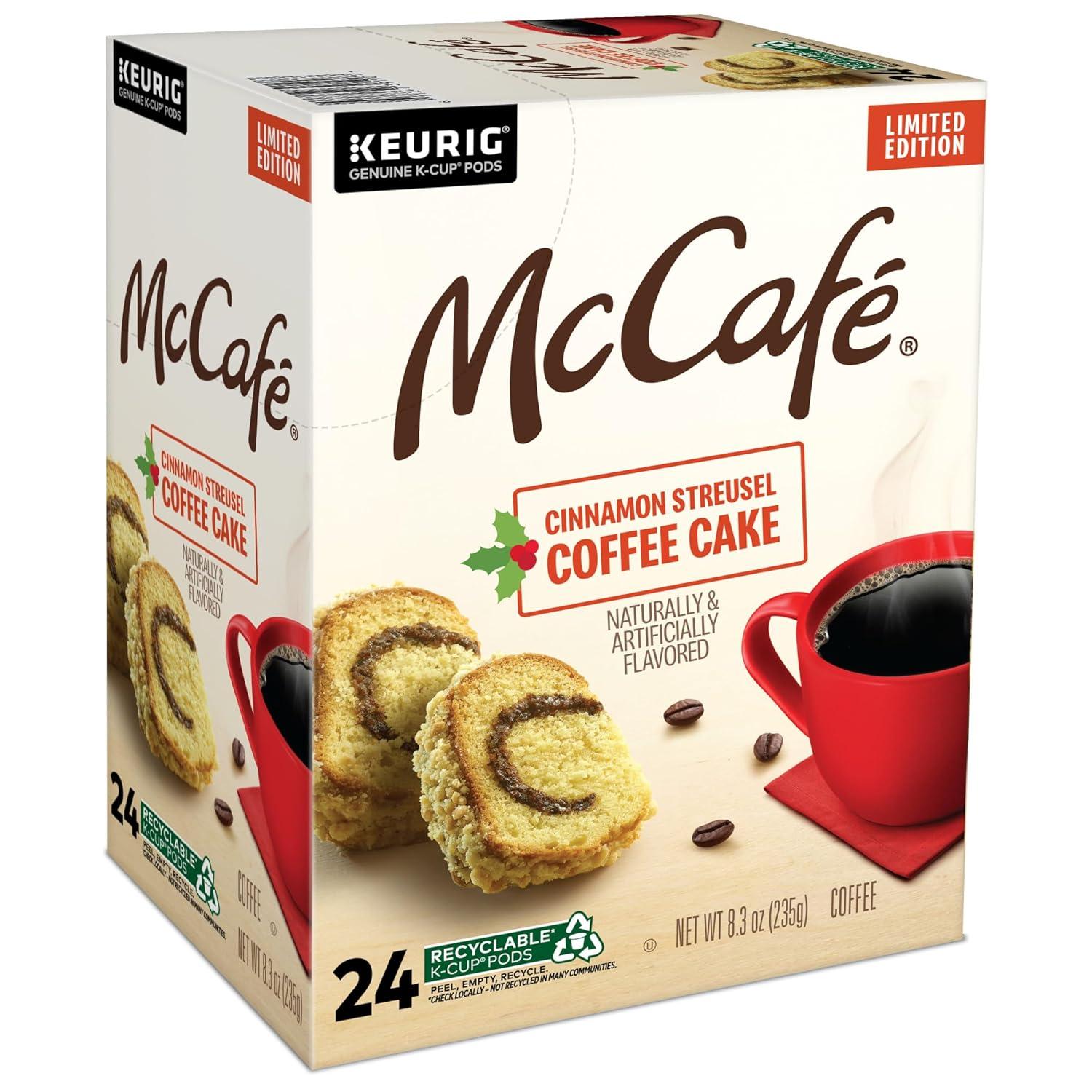 Discover an abundance of freshly baked flavor in every delicious sip. The warming notes of cinnamon and delightful brown sugar finish make this limited-edition blend the perfect sweet reward for any winter's day. We start with 100% premium Arabica coffee beans, carefully harvested from the rich soils and mountainous regions of the foremost coffee-growing areas of the world. Then we expertly roast them in a temperature-controlled environment to bring out the best taste in every cup, every time. Brew a cup of McCafé Cinnamon Streusel Coffee Cake in all Keurig systems. To keep the good going, we use only responsibly sourced coffee. That means we support a healthier planet and an improved quality of life for farming communities. This package contains light roast, caffeinated coffee from 100% Arabica beans. They have been certified Orthodox Union Kosher. With this purchase, you can be assured of premium quality. Simple. Delicious. Brew good by the cupful.