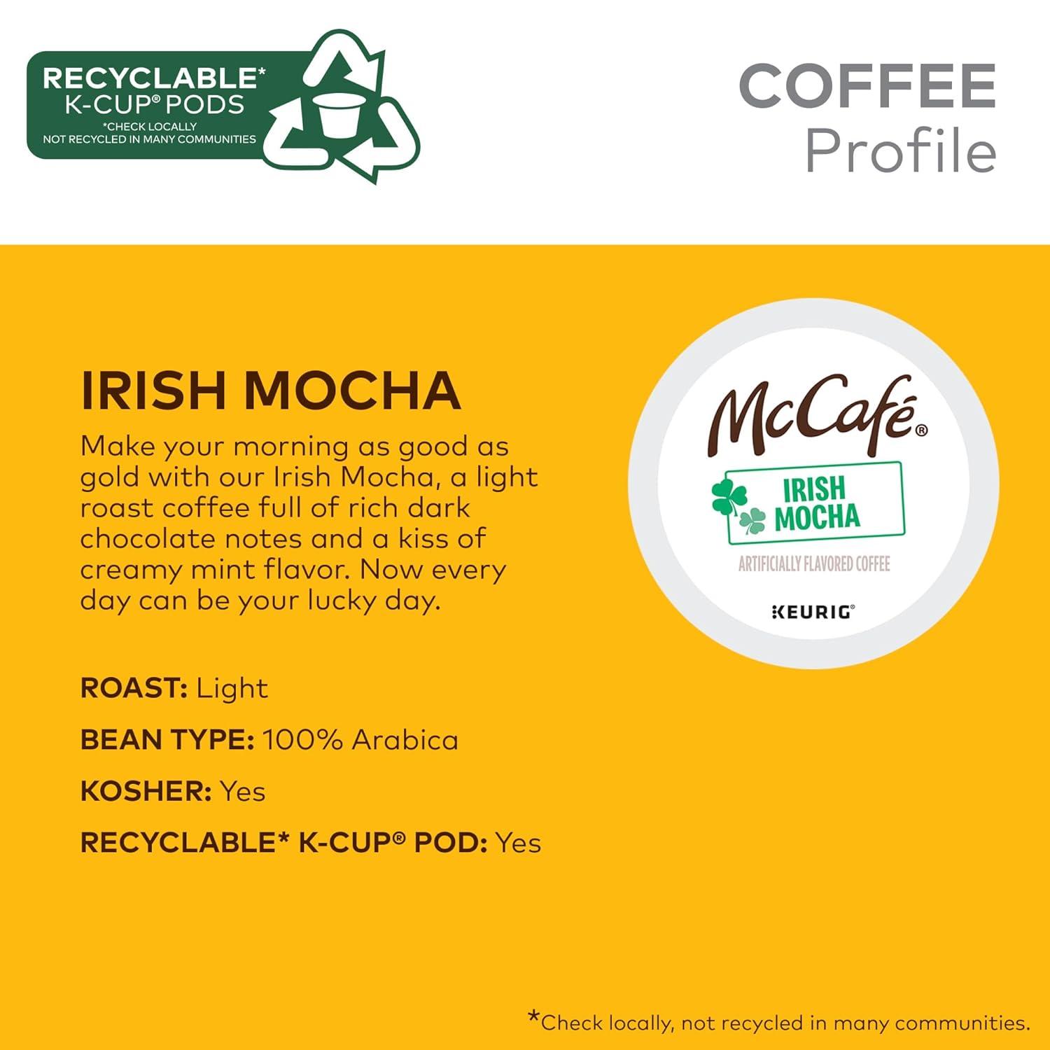 Make every single morning as good as gold with McCafé Irish Mocha, a light roast coffee full of rich dark chocolate notes and a kiss of creamy mint flavor. With this in your morning cup, now every day can be your lucky day. It’s one of the many McCafé coffees you can enjoy at home, at work, or anywhere you want that perfectly brewed pick-me-up. We start with premium Arabica beans, then expertly roast in a temperature-controlled environment to bring out the best taste, every time. And we use responsibly sourced coffee to support a healthier planet and an improved quality of life for farming communities. Brighten your day with McCafé, a simply delicious coffee that keeps the good going. Brew good by the cupful. Choose from all your favorite McCafé varieties – all smooth, delicious, and ready to brew at the touch of a button. Every McCafé K-Cup pod is compatible with any Keurig single serve coffee maker. Just pop one in and enjoy delicious, fresh-brewed coffee in no time at all. Each recyclable* K-Cup pod is filled with the freshest ground coffee and brews a great-tasting cup of coffee, every time. Certified Orthodox Union Kosher.*Check locally. Not recycled in many communities.