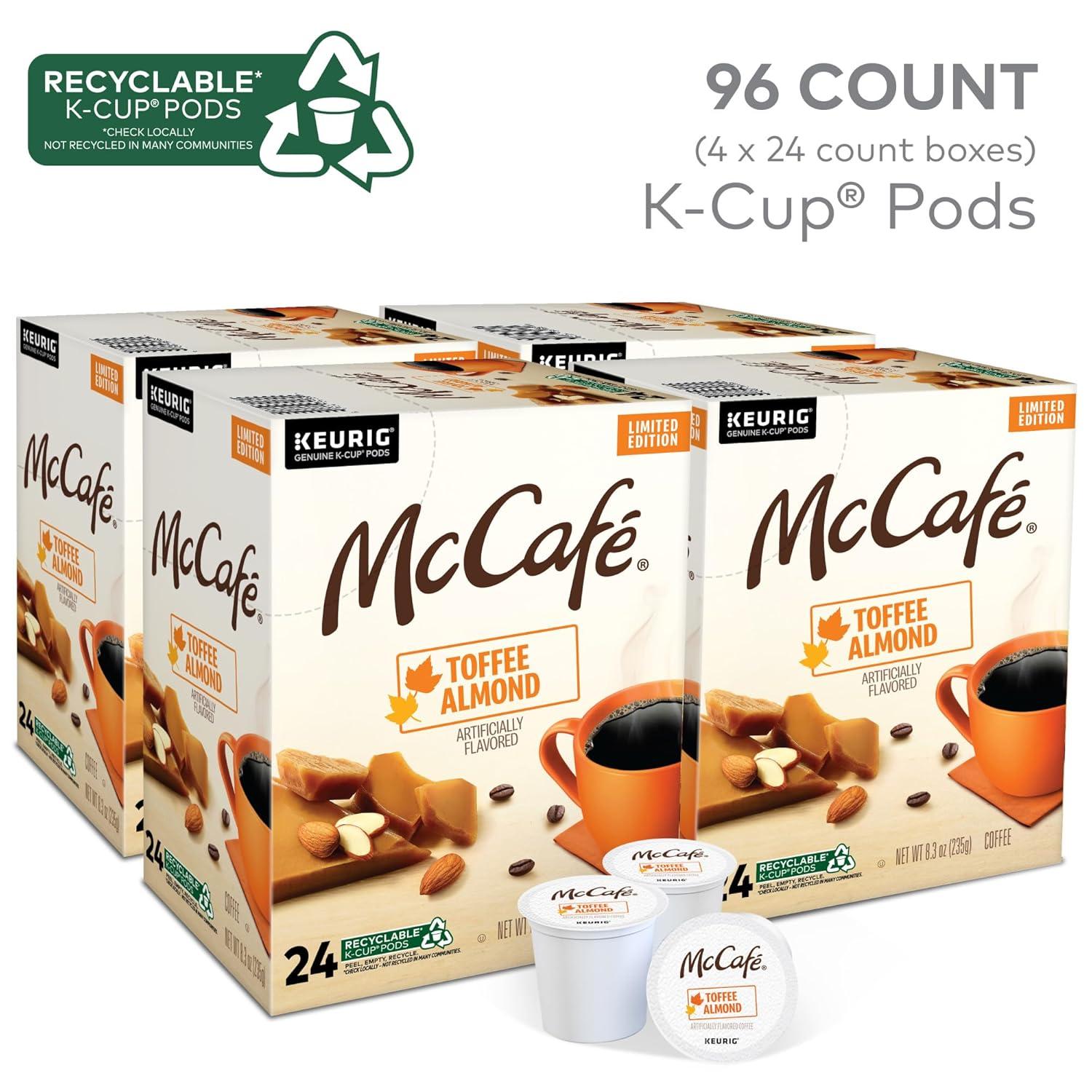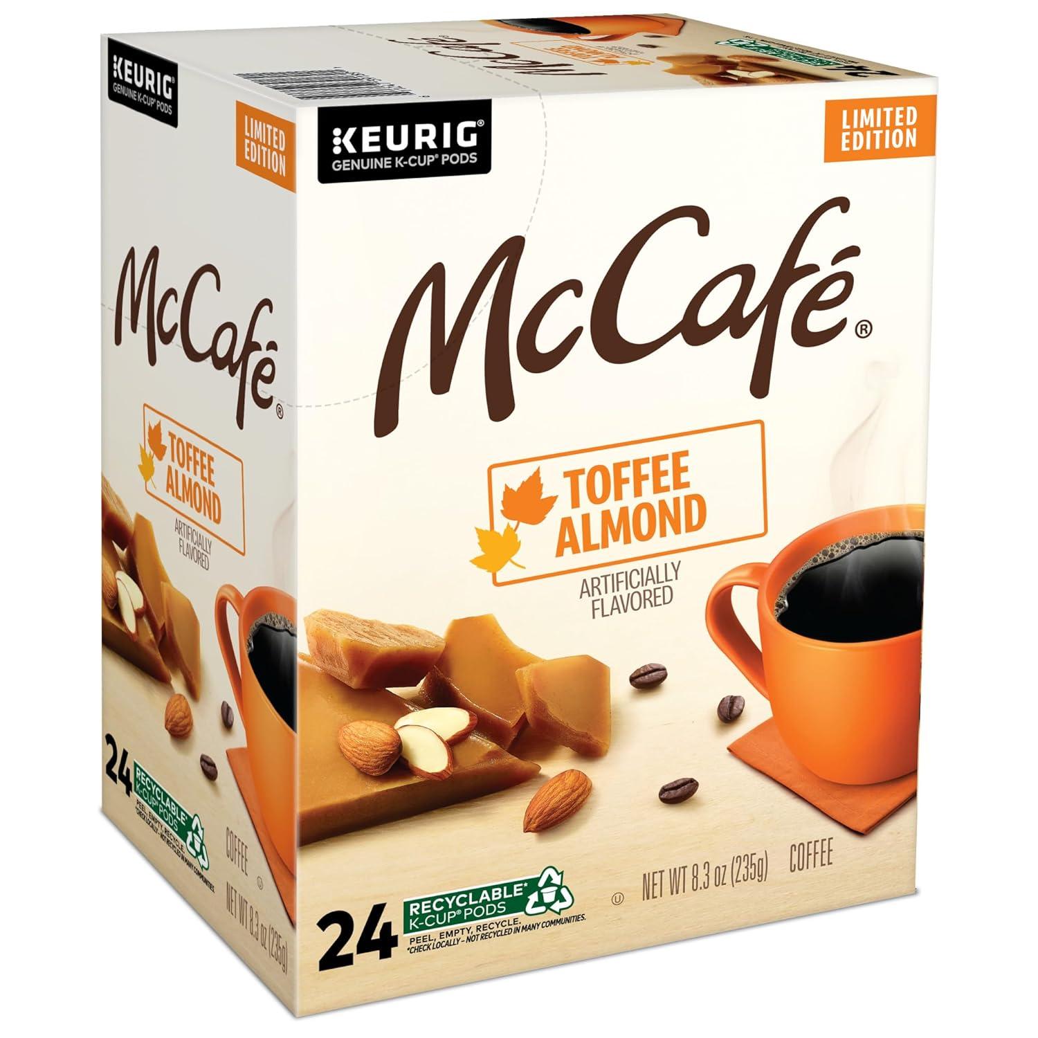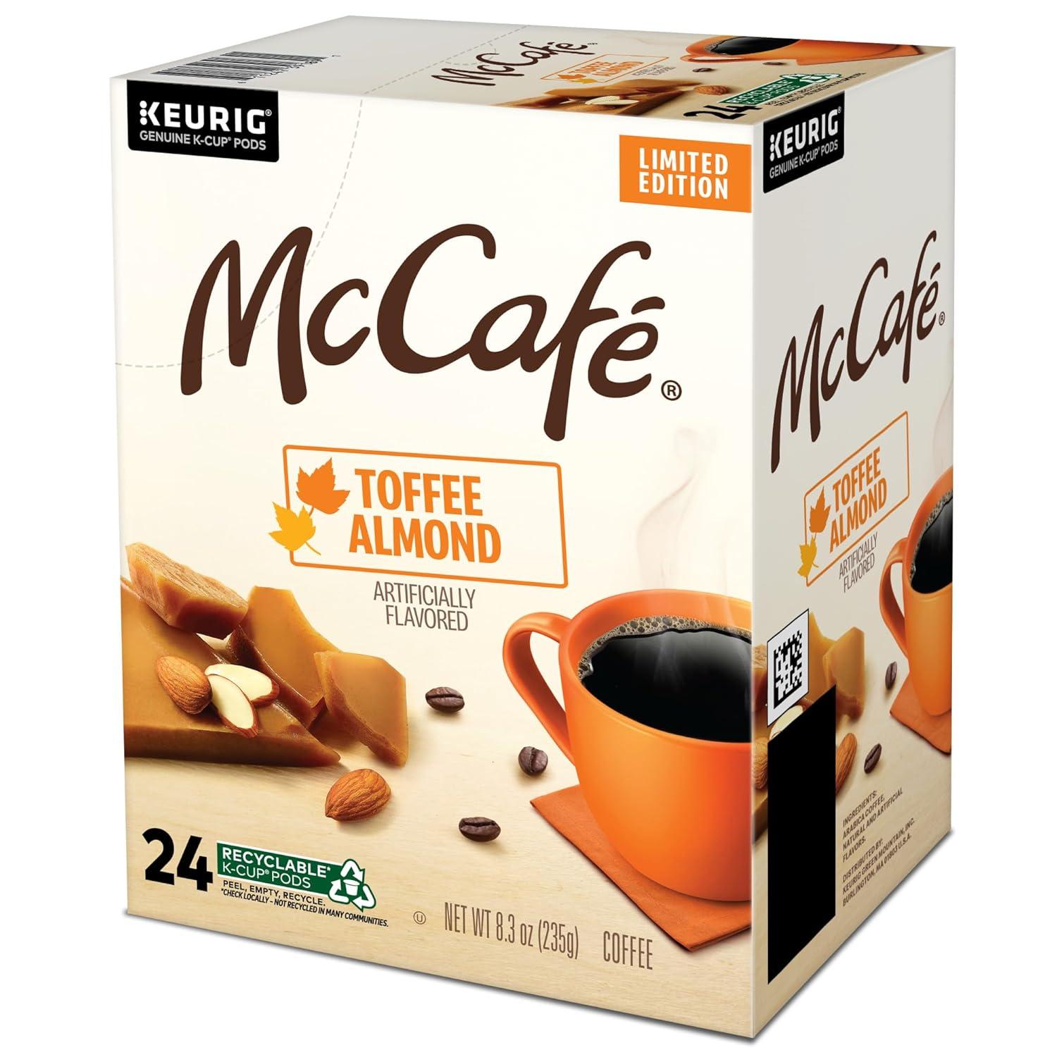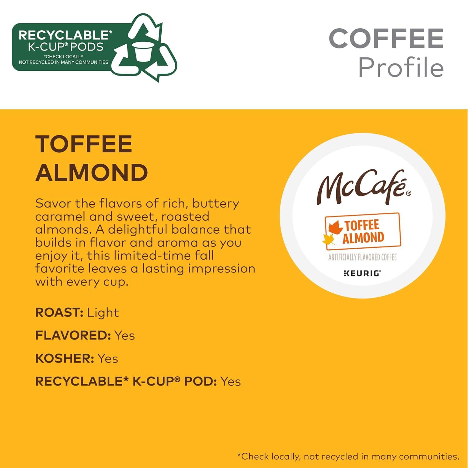 Savor the flavors of rich, buttery caramel and sweet, roasted almonds. A delightful balance that builds in flavor and aroma as you enjoy it, this limited time fall favorite leaves a lasting impression with every cup. We start with 100% premium Arabica coffee beans, carefully harvested from the rich soils and mountainous regions of the foremost coffee-growing areas of the world. Then we expertly roast them in a temperature-controlled environment to bring out the best taste in every cup, every time. Brew a cup of McCafé Toffee Almond in all Keurig brewing systems. To keep the good going, we use only responsibly sourced coffee. That means we support a healthier planet and an improved quality of life for farming communities. This package contains medium roast, caffeinated coffee from 100% Arabica beans. They have been certified Orthodox Union Kosher. With this purchase, you can be assured of premium quality. Simple. Delicious. Brew good by the cupful.